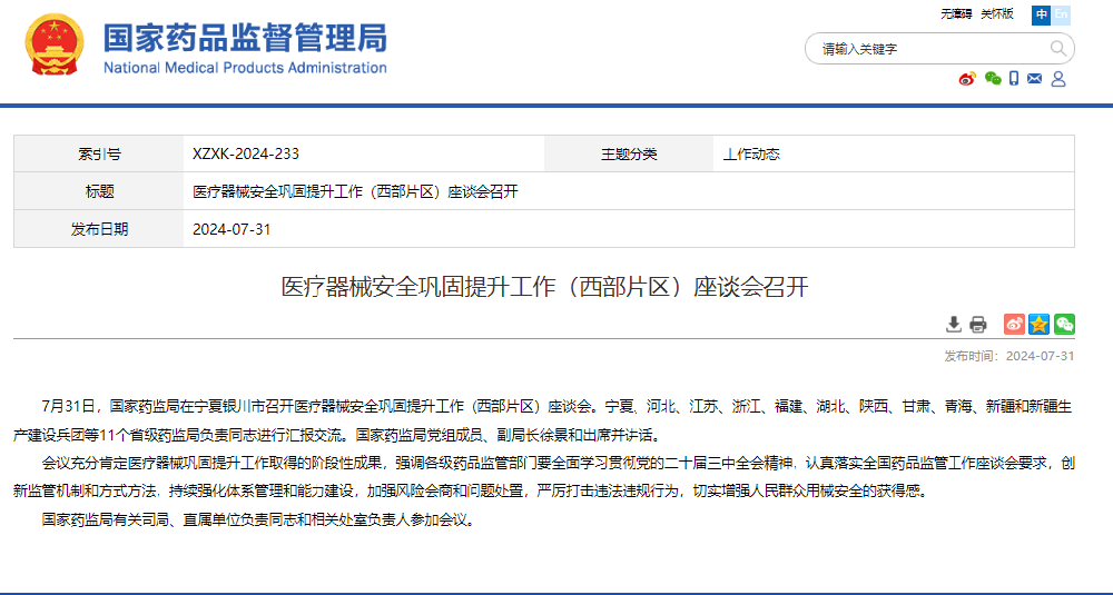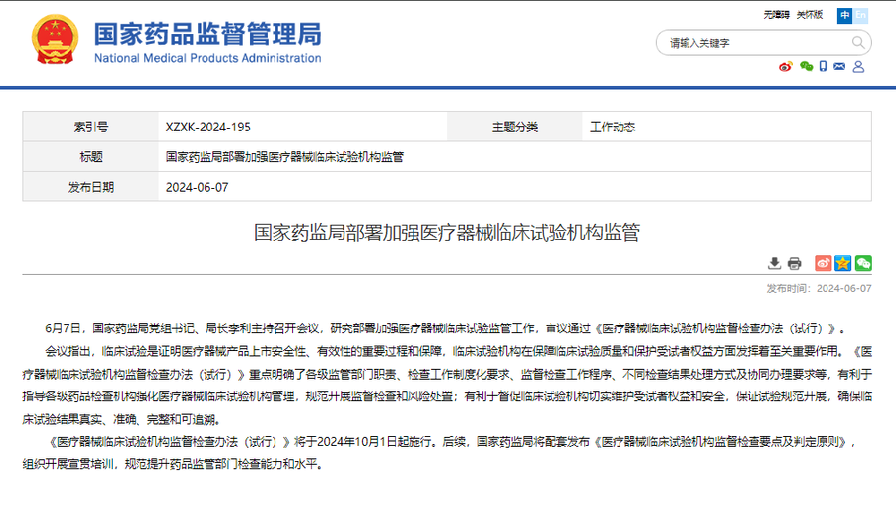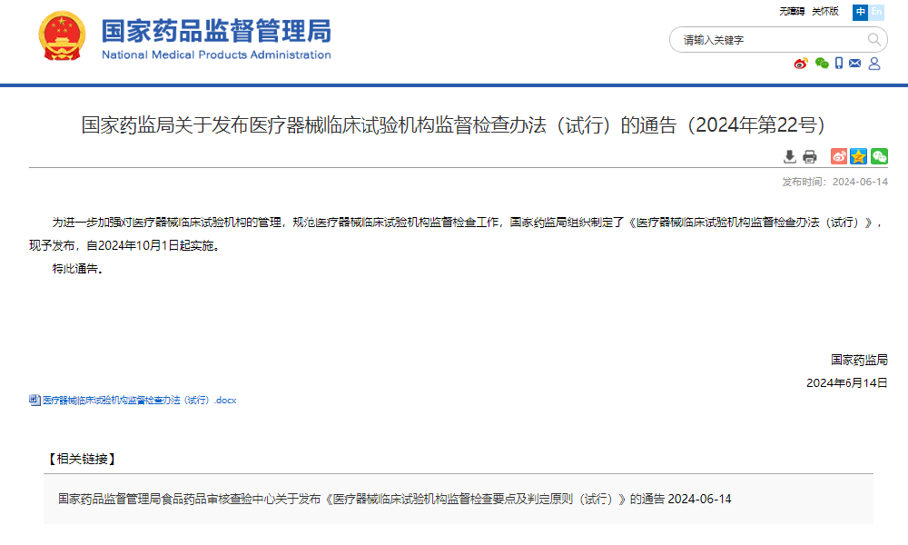 國家藥監(jiān)局關(guān)于發(fā)布醫(yī)療器械臨床試驗(yàn)機(jī)構(gòu)監(jiān)督檢查辦法(試行)的通告(2024年第22號)為進(jìn)一步加強(qiáng)對醫(yī)療器械臨床試驗(yàn)機(jī)構(gòu)的管理,規(guī)范醫(yī)療器械臨床試驗(yàn)機(jī)構(gòu)監(jiān)督檢查工作,國家藥監(jiān)局組織制定了《醫(yī)療器械臨床試驗(yàn)機(jī)構(gòu)監(jiān)督檢查辦法(試行)》,現(xiàn)予發(fā)布,自2024年10月···