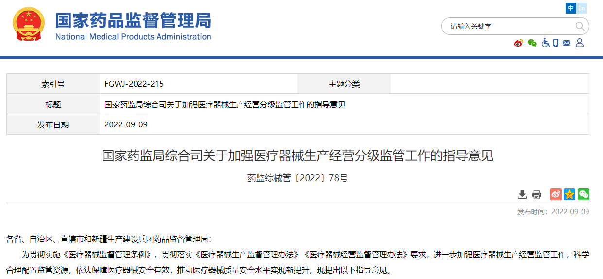《國(guó)家藥監(jiān)局綜合司關(guān)于加強(qiáng)醫(yī)療器械生產(chǎn)經(jīng)營(yíng)分級(jí)監(jiān)管工作的指導(dǎo)意見(jiàn)》,本指導(dǎo)意見(jiàn)自2023年1月1日起施行。原國(guó)家食品藥品監(jiān)督管理總局《關(guān)于印發(fā)〈醫(yī)療器械生產(chǎn)企業(yè)分類分級(jí)監(jiān)督管理規(guī)定〉的通知》(食藥監(jiān)械監(jiān)〔2014〕234號(hào))、《關(guān)于印發(fā)國(guó)家重點(diǎn)監(jiān)管醫(yī)療器械目錄···